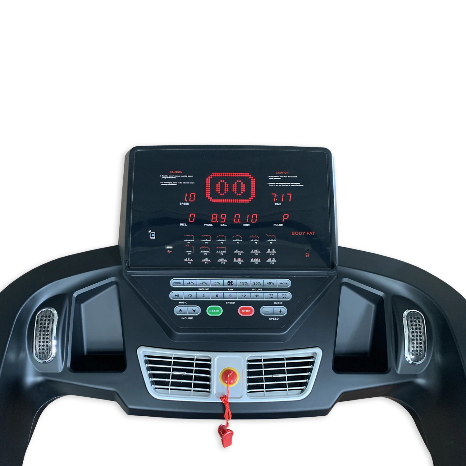 Funciones de las teclas: Los comandos son START, STOP, PROG, MODE, SPEED/+/-, INCLINE/+/-.