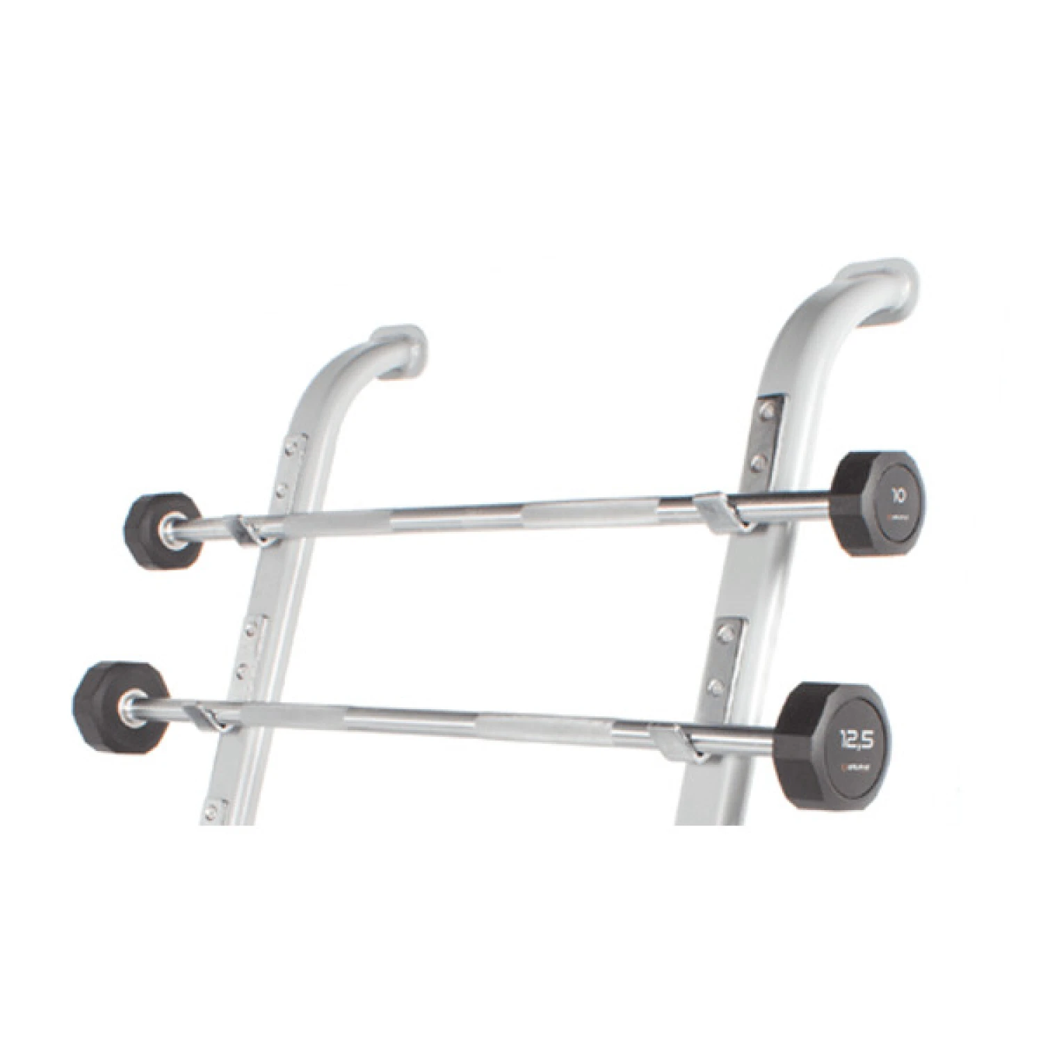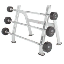 Ideal para almacenar hasta 5 barras de pesas Pro-Style, este soporte ofrece una solución práctica para organizar su equipo de entrenamiento. Las barras de pesas no están incluidas, pero esta estantería te permite tener tus barras a mano y organizadas, facilitando tu entrenamiento.